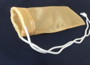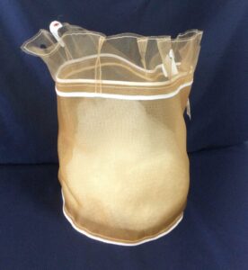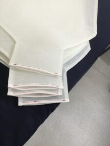 製品 サランネット平巾着袋 24cm×1cm お客様からの要望 溶液のろ過フィルターに使用。紐を付けた巾着型にして欲しい。 くればぁからの提案 サラン濾過布をホツレ防止の為にヒートカットしてから、端部を挟み込むように縫製