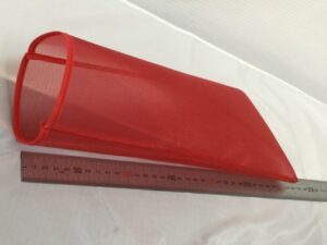 製品 ナイロンメッシュカバー (モノフィラメント赤色) W150mm×320mm お客様からの要望 洗浄時にメッシュ袋の中にスポンジを入れて使用。破損した場合に目立つメッシュ、どの工程での異物なのか特定する