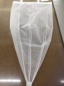 ナイロン50メッシュ(NB50)の加工品実績です。 ナイロン50メッシュを台形型に縫製加工したメッシュストレーナーです。